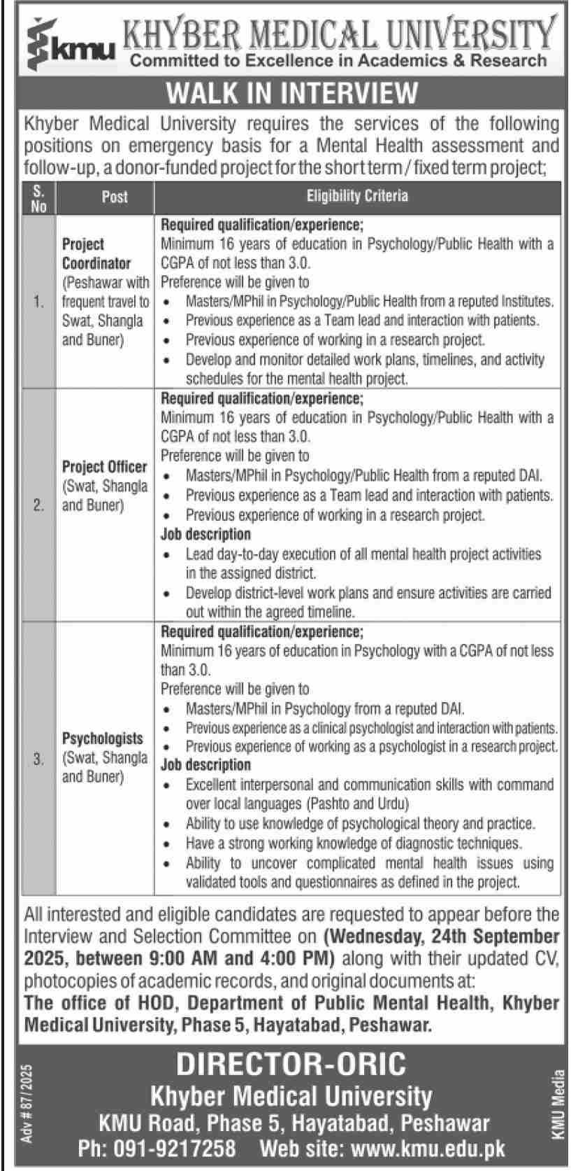 If you are looking for Khyber Medical University (KMU) Jobs October 2025, this is a great opportunity to work in one of the top educational institutions in Khyber Pakhtunkhwa. KMU is advertising several positions for enthusiastic and talented professionals as part of its mental health project.